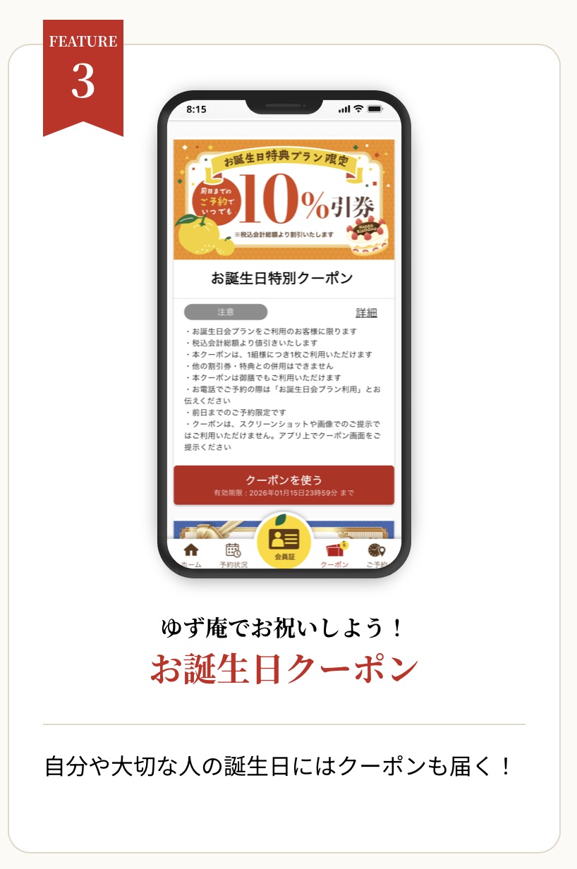 ゆず庵の割引制度は、「大勢で集まるお祝いの席」を「アプリの誕生日クーポン」で予約することで、最大のメリットを享受できる仕組みといえます。