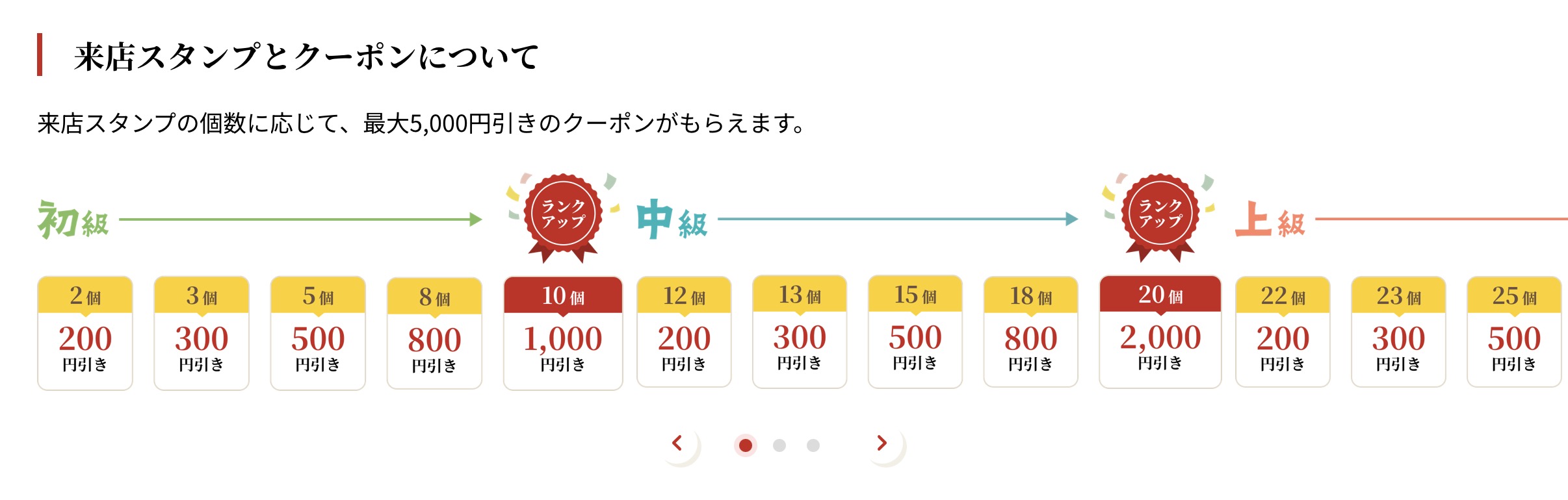 スタンプ制度: 来店ごとにスタンプを貯めることができ、貯まった個数に応じて「500円引き」や「1000円引き」、最大で**「5000円引き」**のクーポンと交換できます。